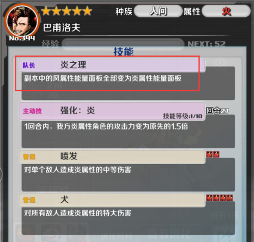 上图所示的队长技能就是所谓的转板技能。也就是说,如果玩家携带的队伍是由上图的角色作为队长,。当使用这支队伍进行副本战斗时,游戏中风属性面板出现概率为0,而火属性面板的出现概率为原本风属性加上火属性面板的概率总和。玩家在游玩时很明显地可以感受到火属性的出现率高了,这样对于纯火属性的队伍来说就会顺畅很多,可以有效减少“怎么没有火的啊”这类情况的发生。