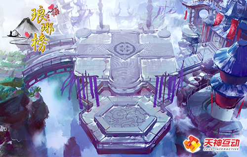 除了重峦叠翠的山峰和高大的建筑,新手村里也有许多其它的美丽风景。比如这醉翁亭的一角,鲜艳的色彩和独具特色的建筑给人一种心旷神怡之感。由于这是原画设计稿,大家可能无法非常清晰的感受到这种美景,但在游戏中,搭配最先进引擎的效果,你将会感受到微风佛面,满树花舞的动态美感,那么美的场景,相信你一定也非常期待。