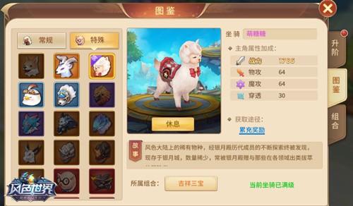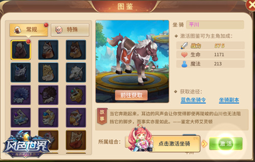无论你是想看自己已经拥有的哪种坐骑,它们对自己的加成作用是哪些,还是心仪何种坐骑,却不知道从何入手,都可以进入坐骑图鉴,很方便地查看各大坐骑的属性、坐骑获得途径、坐骑所属组合,如此一来,对整个坐骑系统都时时刻刻心里有数啦!