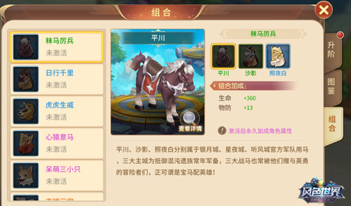 特定的坐骑组合,还可激活组合加成属性,为自己的角色永久加成属性哦!