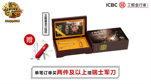 当然,除却天人级别的精彩外,《传奇世界3D》的跨界新作也同样令人瞩目。由盛大游戏官方授权,联合中国工商银行推出的《传奇世界3D》正版屠龙刀银镀金吊坠在京东商城工银金行家旗舰店、中国工商银行融e购及中国工商银行线下网点火热发售中! 12月31日前,在京东商城工银金行家旗舰店购买,使用京东支付方式下的工商银行小白电子账户支付,立减50元!更有中国工商银行融e购推出预售优惠活动倾力助阵,预售期间单笔订单买两件及以上赠瑞士军刀一件(赠品限量200件)!