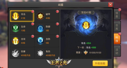 如果战盟已经有一定规模,而且战力高的玩家比较活跃,那么恭喜你,大家都能有福同享了!先点开战盟仓库,可以看到战盟成员的捐献的材料,其中都是以武器为主,捐献武器可以获得仓库积分。我们再点开战盟科技,可以看到里面包含了八种人物最主要的属性。我们可以通过战盟贡献来提升自己所需要的属性值,那么战盟贡献又该怎么获取?