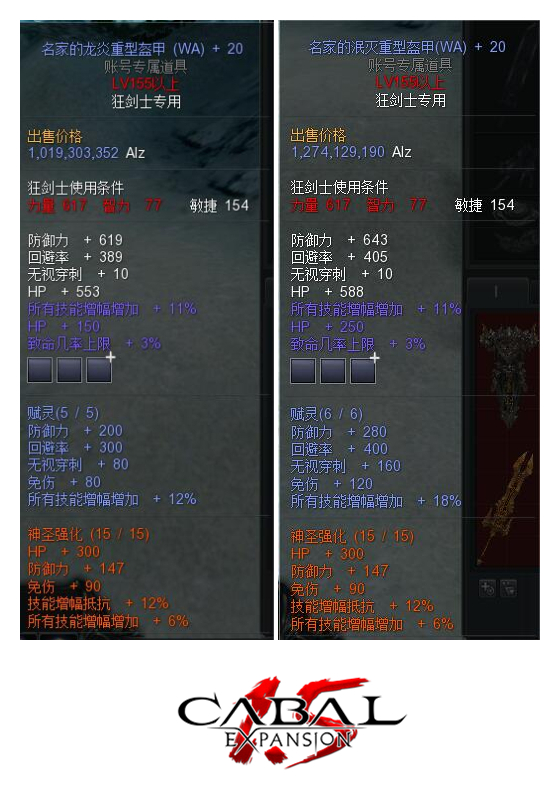 由上图我们可以看出,同样等级的龙炎和泯灭装备相比的话。泯灭装备防御力、回避率等属性都有很大程度上的提升。虽然战斗力并不是代表一个人究竟有多么的厉害,但毕竟战斗力提升起来的话,在PK对抗时相信也能获得更多的先机与优势。