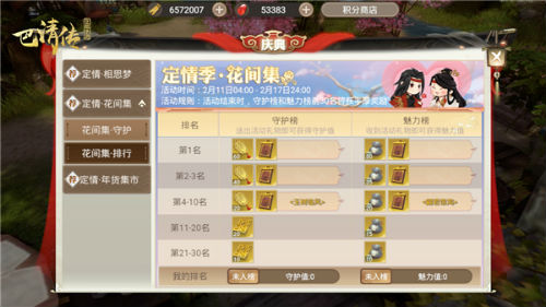 在“定情花间集”活动中,玩家送出情人节礼物(包括:定情玫瑰、红袖添香以及一抹花色)可获得守护值,并可参与守护排行榜,赢取守护排行奖励。若玩家守护值达到指定数值,还能额外领取丰厚奖励。