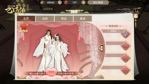 在游戏中,满足结为知己条件的异性主事,可前往东施处结为知己,结为知己后将开启情缘技能,情缘成就,和情缘商店(可购买情缘华服),双方共同完成情缘成就,并累计情缘值达到520时,可前往西施处结为伴侣。