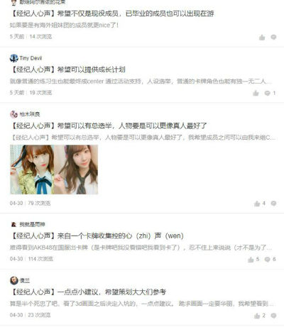 目前《AKB48樱桃湾之夏》官方也正在举办“策划面对面”的活动,玩家们可以说出自己对游戏未来的设想或建议,参与活动将有机会获得测试激活码。截止到今日,小编也发现已经有很多粉丝和玩家提出了自己的宝贵意见。
