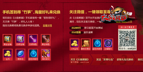 立即关注《太极熊猫》官方微信(snailtjxm),发送“至尊礼包”关键字给微信君,即可获得蕴藏大量金币、黑市交易令以及极品符文等游戏道具的至尊礼包码啦!